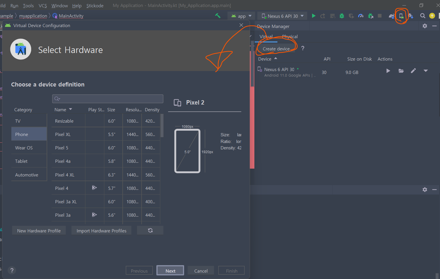 Device Manager에 들어가면 Create device가 보이는데 그것을 클릭하면 옆에 화면이 뜹니다. 거기에서 맘에 드는 핸드폰(?)을 골라 주시면 됩니다. 만약 예~전에 다운 받았었따 하면 제 화면처럼 이미 Device가 존재할텐데요. 그렇다면 오른쪽에 실행(플레이) 버튼을 눌러주시면 됩니다!