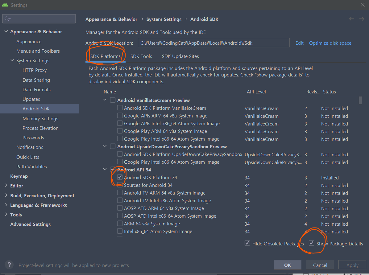 이런 화면이 나오는데 Show Package Details 누르면 Android API 34 부분에 Android SDK Platform 34 가 보이게 됩니다! 이것을 √ 한 후 Apply 누르시고 다운받으시면 됩니다.