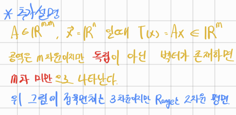 왼쪽 그림의 경우 m차원을 최대한 활용하지 못하여 분포가 m차원 미만으로 나타날 경우, 오른쪽은 m차원을 다 활용하여 치역자체가 m차원의 Span일 경우를 의미함. (치역 = 공역)