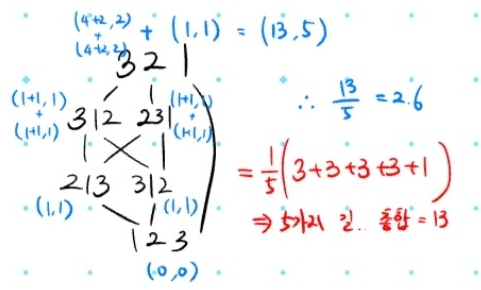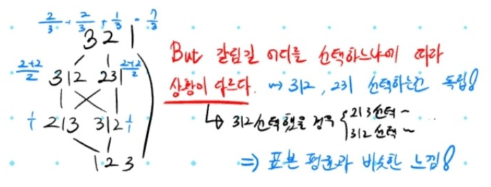 위의 그림에서 쓴 글처럼 사실 어느 것을 선택하느냐에 따라 상황이 완전 달라진다. 또한 321->312->213->123으로 가는 확률이 1/전체 가지수 = 1/5 가 아니라 1/3 * 1/2 = 1/6 이다.