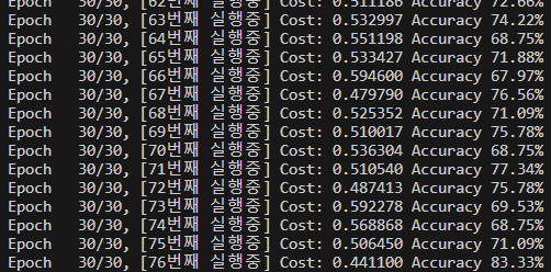 print('Epoch {:4d}/{}, [{}번째 실행중] Cost: {:.6f} Accuracy {:2.2f}%'.format(