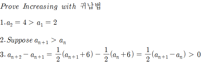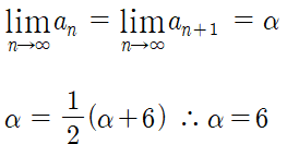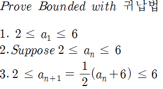 이 때 상한을 6 으로 설정한 이유는 위에서 구한 값을 한번 사용해 봤습니다. 위의 2가지 사실을 증명했으니 해당 수열은 수렴한다는 사실을 알 수 있으며 위의 처음 Wrong Solution을 사용할 수 있음을 보이고 답을 구하면 정답이 되겠습니다~