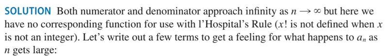 일단 이 문제는 로피탈을 쓰고 싶지는 않지만 애초에 쓸 수 없습니다. 왜냐하면 factorial 함수는 음이 아닌 정수에서 정의되었기에 f(x) 로 대응시킬 수 없기 때문입니다. 원서의 해설은 아래와 같습니다. 따라서 수열의 극한을 계산할 때 대부분 그냥 함수의 극한값을 계산하는 것 처럼 계산하실 수 있는데, 함수로 대응시킬 수 있음을, 즉 n에서 연속함을 보여야 합니다. (교바교로 감점할 수도..)