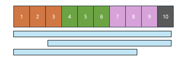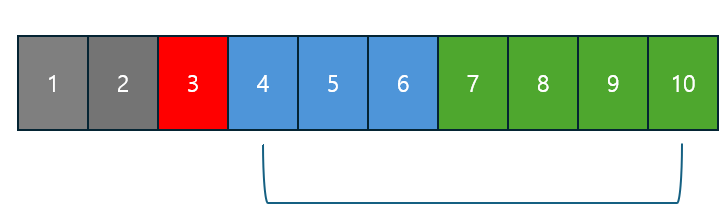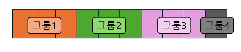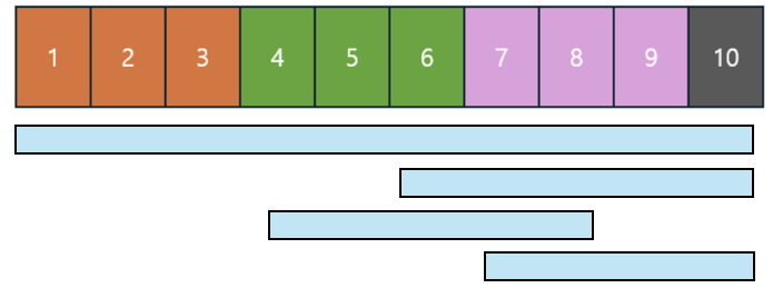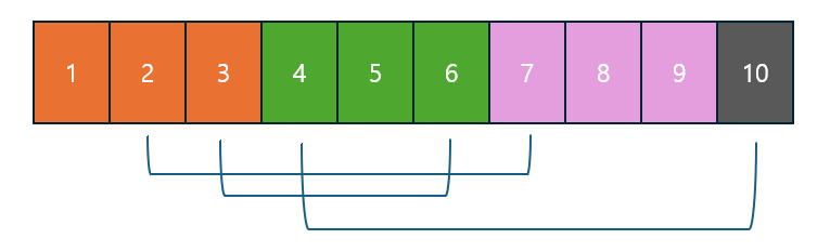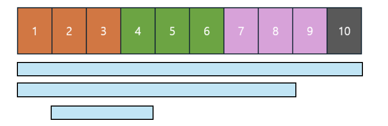 일단 데이터 길이를 N으로 했을 때 sqrt(N) 의 길이로 그룹을 나눕니다. 위 그림은 N = 10 일때의 그림이며 4개의 구간으로 나눌 수 있습니다. ( 왜 sqrt(N) 으로 나누는지는 아래에 설명하겠습니다 )