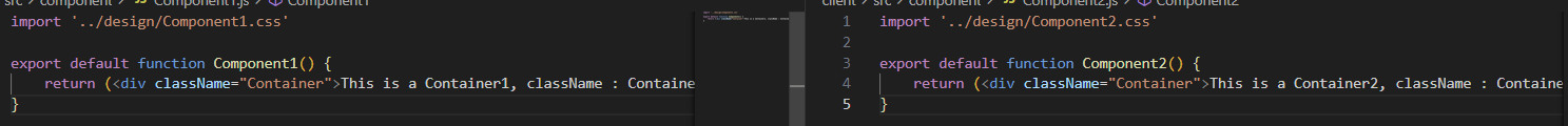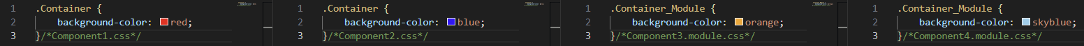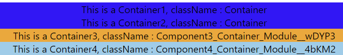 어라? 분명 각각의 파일마다 다른 css 파일을 import 했는데 Container1, Container2 의 색깔이 파란색으로 같습니다! css파일 경로로 import 한다고 해서 지역 scope라고 단정지을 수 없습니다. 사실 css파일은 전역으로 적용되기 때문에 className이 같다면 다른 파일을 import해도 위와 같은 결과가 나오게 됩니다.